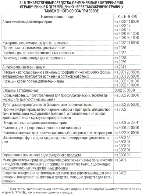 2.15 Лекарственные средства, применяемые в ветеринарии, ограниченные к перемещению через таможенную границу таможенного союза при ввозе