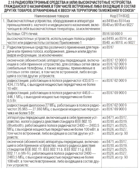 2.16 Радиоэлектронные средства и (или) высокочастотные устройства гражданского назначения, в том числе встроенные либо входящие в состав других товаров, ограниченные к ввозу на таможенную территорию таможенного союза