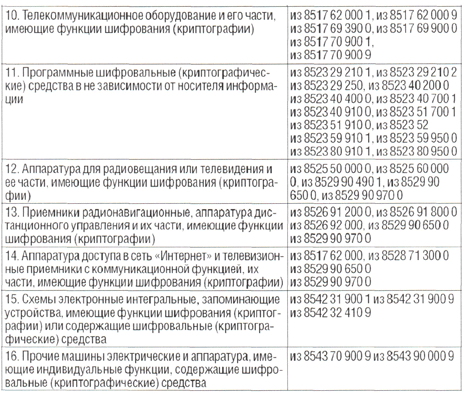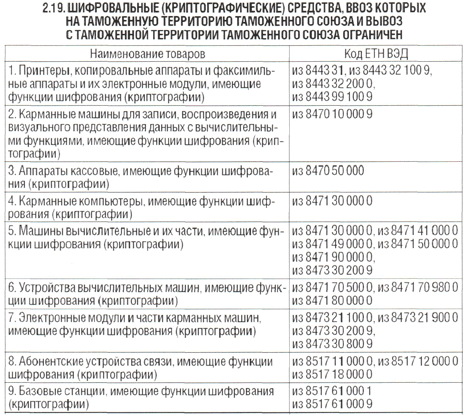 2.19 Шифровальные (криптографические) средства, ввоз которых на таможенную территорию таможенного союзаи вывоз с таможенной территории таможенного союза ограничен c 1 января 2010 года |