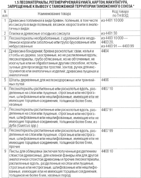 1.5 Лесоматериалы, регенерируемая бумага, картон, макулатура, запрещенные к вывозу с таможенной территории таможенного союза |