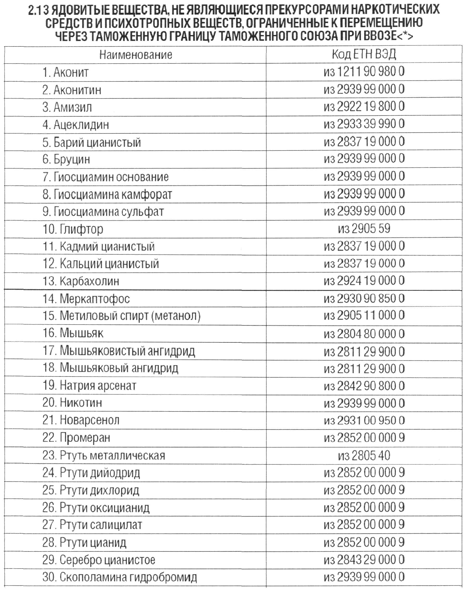 2.13 Ядовитые вещества, не являющиеся прекурсорами наркотических средств и психотропных веществ, ограниченные к перемещению через таможенную границу таможенного союза при ввозе |