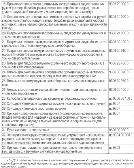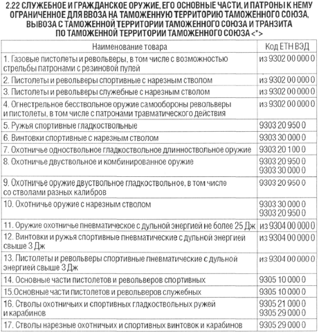 2.22 Служебное и гражданское оружие, его основные части и патроны к нему, ограниченное для ввоза на таможенную территорию таможенного союза, вывоза с таможенной территории таможенного союза и транзита по таможенной территории таможенного союза |