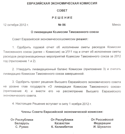 решил: 2. Утвердить ликвидационный баланс Комиссии (приложение 3) и считать ликвидацию Комиссии Таможенного союза завершенной. 3. Одобрить проект решения Высшего Евразийского экономического совета на уровне глав государств «О ликвидации Комиссии Таможенного союза» (приложение 4) и внести его на рассмотрение Высшего Евразийского экономического совета. 4. Настоящее Решение вступает в силу 1 ноября 2012 г.