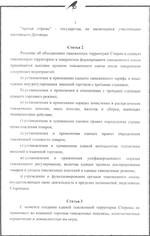 "таможенный союз" - форма торгово-экономической интеграции Сторон, предусматривающая единую таможенную территорию, в пределах которой во взаимной торговле товарами, происходящими с единой таможенной территории, а также происходящими из третьих стран и выпушенными в свободное обращение на этой таможенной территории, не применяются таможенные пошлины и ограничения экономического характера, за исключением специальных защитных, антидемпинговых и компенсационных мер, При этом Стороны применяют единый таможенный тариф и другие единые меры регулирования торговли товарами с третьими странами;