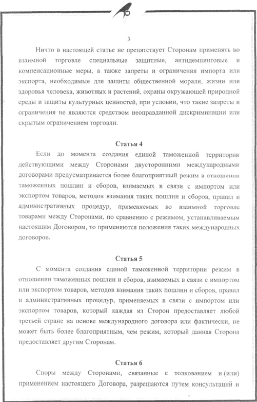С момента создания единой таможенной территории режим в отношении таможенных пошлин и сборов, взимаемых в связи с импортом или экспортом товаров, методов взимания таких пошлин и сборов, правил и административных процедур» применяемых в связи с импортом или экспортом товаров, который каждая из Сторон предоставляет любой третьей стране на основе международного договора или фактически, не может быть более благоприятным, чем режим, который данная Сторона предоставляет другим Сторонам.