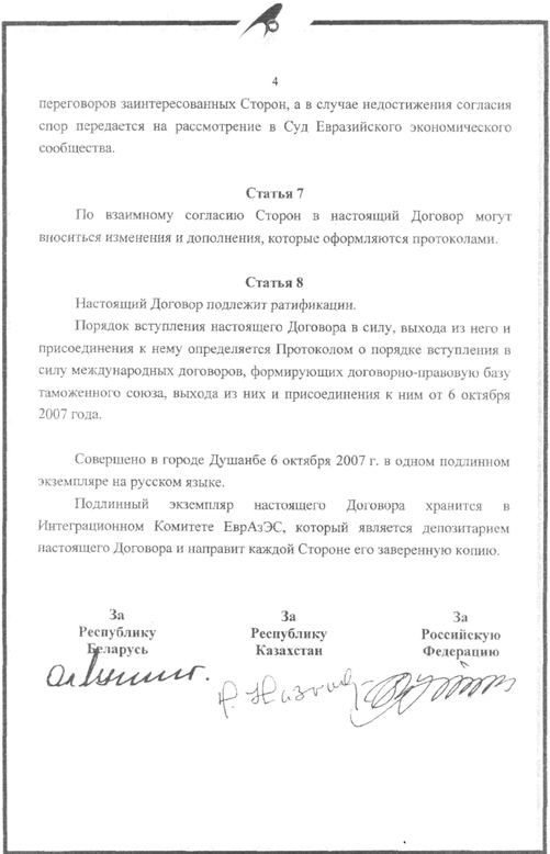 Подлинный экземпляр настоящего Договора хранится в Интеграционном Комитете ЕврАзЭС, который является депозитарием настоящего Договора и направит каждой Стороне его заверенную копию.