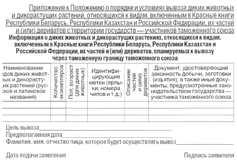 8. В случае если в соответствии с законодательством государства — члена таможенного союза решение о выдаче лицензии принимается уполномоченным органом по согласованию с другим органом государственной власти государства — члена таможенного союза, то заявитель представляет в орган государственной власти государства — члена таможенного союза, который согласовывает выдачу лицензии, документы, указанные в пункте 6 настоящего Положения, а также документы, предусмотренные пунктом 3 статьи 3 Соглашения. 9. Срок рассмотрения документов, представляемых в согласующий орган, определяется государством — членом таможенного союза. 10. В выдаче лицензии (согласовании заявления о выдаче лицензии) может быть отказано по основаниям, указанным в пункте 6 статьи 3 Соглашения, а также в случае непредставления документов, предусмотренных пунктом 6 настоящего Положения. 11. В случае если заявление о выдаче лицензии оформляется на вывоз нескольких видов диких животных и дикорастущих растений, относящихся к видам, включенным в красные книги Республики Беларусь, Республики Казахстан и Российской Федерации, их частей и (или) дериватов, соответствующих одному 10-значному классификационному коду по ЕТН ВЭД, к заявлению оформляется приложение. 12. Уполномоченный орган вправе выдавать разъяснения (заключения) по вопросам выдачи лицензий. Информация о выданных разъяснениях Приложение к Положению о порядке вывоза с таможенной территории таможенного союза диких животных и дикорастущих растений, относящихся к видам, включенным в красные книги Республики Беларусь, Республики Казахстан и Российской Федерации, их частей и (или) дериватов с территории государств-участников таможенного союза. Информацмя о диких животных и дикорастущих растений, относящихся к видам, включенным в Красные книги Республики Беларусь, Республики Казахстан и Российской Федерации, их частей и (или) дериватов с территории государств-участников таможенного союза.