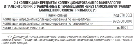 2.4 КОЛЛЕКЦИИ И ПРЕДМЕТЫ КОЛЛЕКЦИОНИРОВАНИЯ ПО МИНЕРАЛОГИИ И ПАЛЕОНТОЛОГИИ, ОГРАНИЧЕННЫЕ К ПЕРЕМЕЩЕНИЮ ЧЕРЕЗ ТАМОЖЕННУЮ ГРАНИЦУ ТАМОЖЕННОГО СОЮЗА ПРИ ВЫВОЗЕ (*)
