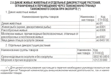 c 1 января 2010 года 2.6 ДИКИЕ ЖИВЫЕ ЖИВОТНЫЕ И ОТДЕЛЬНЫЕ ДИКОРАСТУЩИЕ РАСТЕНИЯ, ОГРАНИЧЕННЫЕ К ПЕРЕМЕЩЕНИЮ ЧЕРЕЗ ТАМОЖЕННУЮ ГРАНИЦУ ТАМОЖЕННОГО СОЮЗА ПРИ ЭКСПОРТЕ (*) |