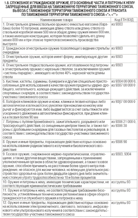 1.6. СЛУЖЕБНОЕ И ГРАЖДАНСКОЕ ОРУЖИЕ, ЕГО ОСНОВНЫЕ ЧАСТИ, И ПАТРОНЫ К НЕМУ ЗАПРЕЩЕННЫЕ ДЛЯ ВВОЗА НА ТАМОЖЕННУЮ ТЕРРИТОРИЮ ТАМОЖЕННОГО СОЮЗА, ВЫВОЗА С ТАМОЖЕННОЙ ТЕРРИТОРИИ ТАМОЖЕННОГО СОЮЗА И ТРАНЗИТА ПО ТАМОЖЕННОЙ ТЕРРИТОРИИ ТАМОЖЕННОГО СОЮЗА <*>, <**> c 1 января 2010 года |